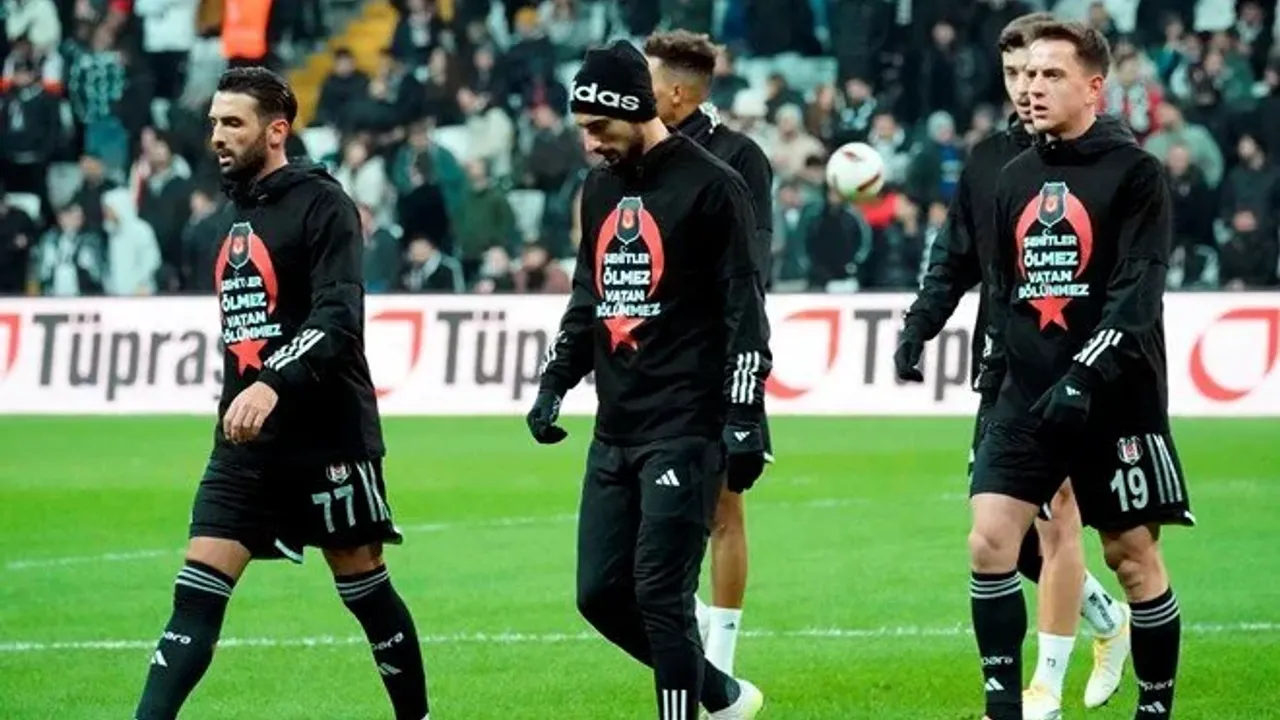 Siyah-beyazlı oyuncular, maç öncesi ısınmaya ‘Şehitler ölmez, vatan bölünmez’ yazılı tişörtlerle çıktı.