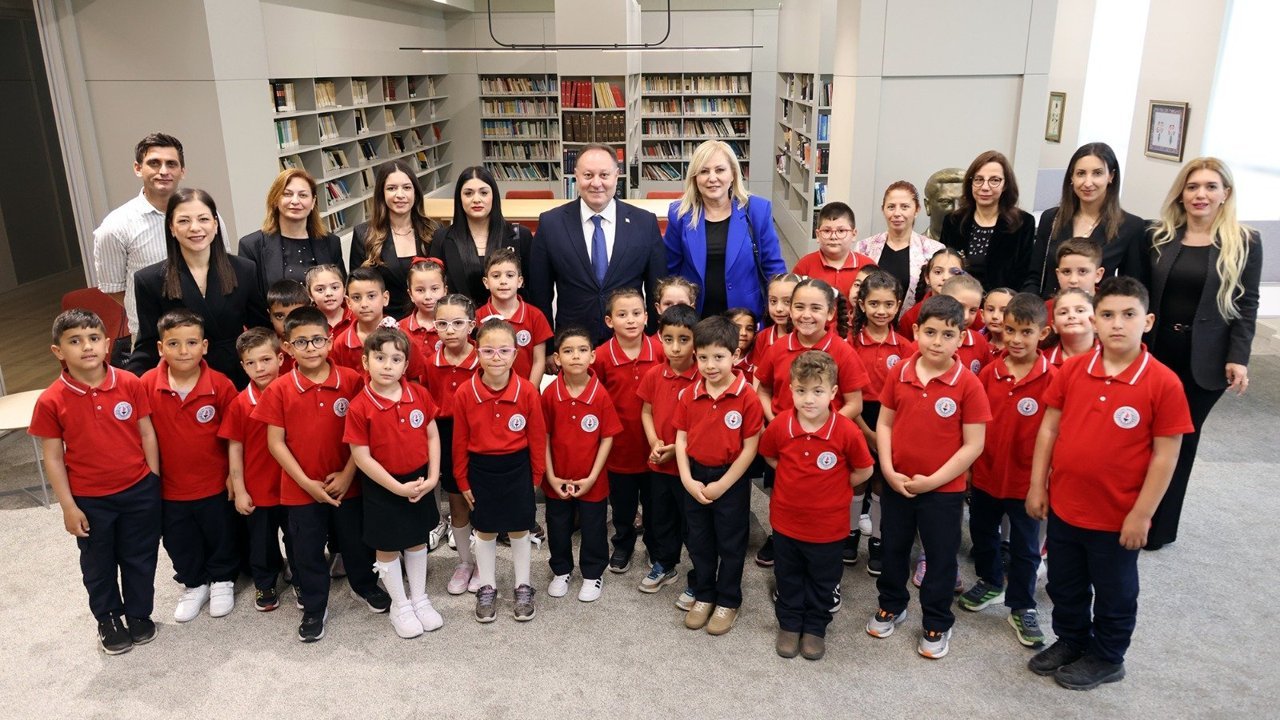 Cumhuriyet Meclisi Başkanı Ziya Öztürkler, Okul Müdürü Filiz Ustam ve Güzelyurt Barış İlkokulu öğrencileri daha sonra hep birlikte Cengiz Ratip Kütüphanesi’ni gezdi.
